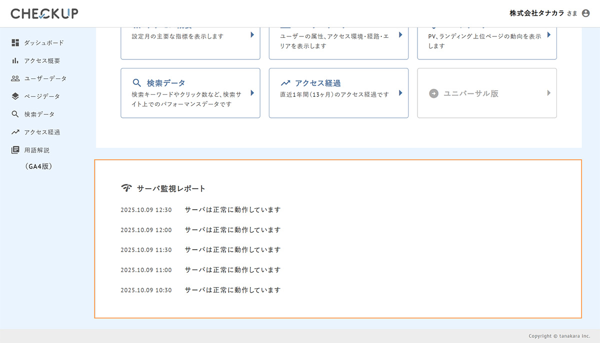 もし、監視レポートで異常を検知した場合は、タナカラのシステム担当者が原因を調べて対応するので、ホームページが見られない時間を最小限に抑えることができます。