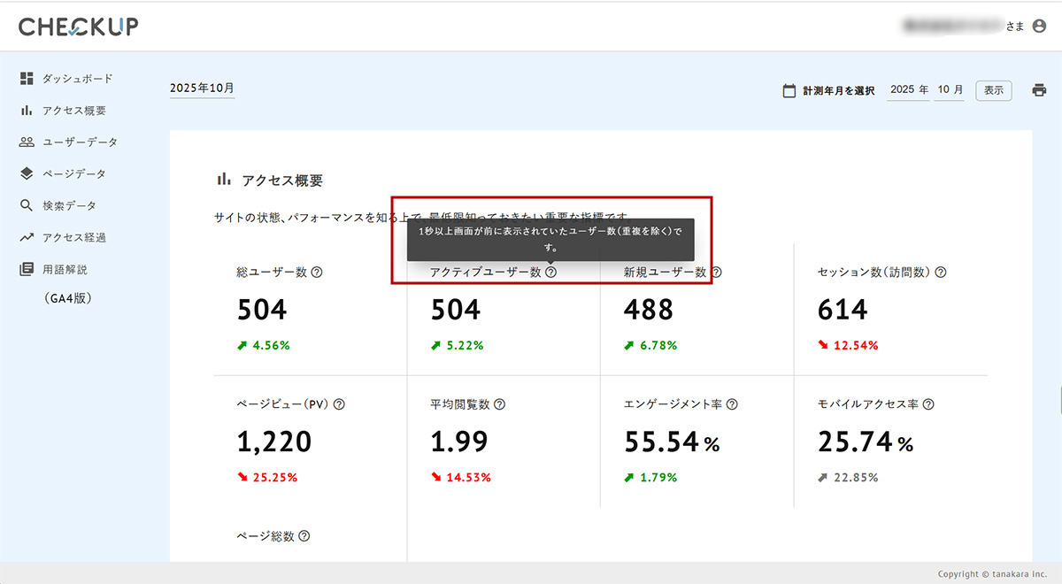 そこで『TANAKARA CHECKUP』では、アクセス解析の内容を”見やすく、分かりやすく”しました。画面内では難しい専門用語に注釈を添え、用語集ページも用意して、アクセス解析のデータを理解できるよう工夫しています。グラフや色の変化などで全体の動きを直感的に確認できる点も特徴です。