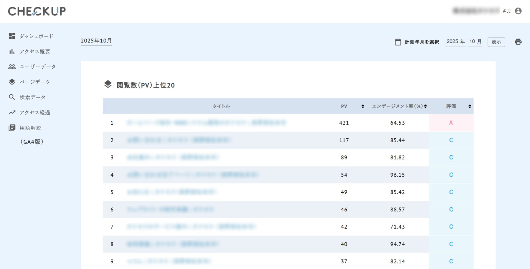 「会社概要よりもサービス紹介ページがよく見られている」などの傾向を知ることで、今後の発信や更新内容の参考になります。CHECKUPでは、「よく見られているページ」をランキング形式で確認できます。