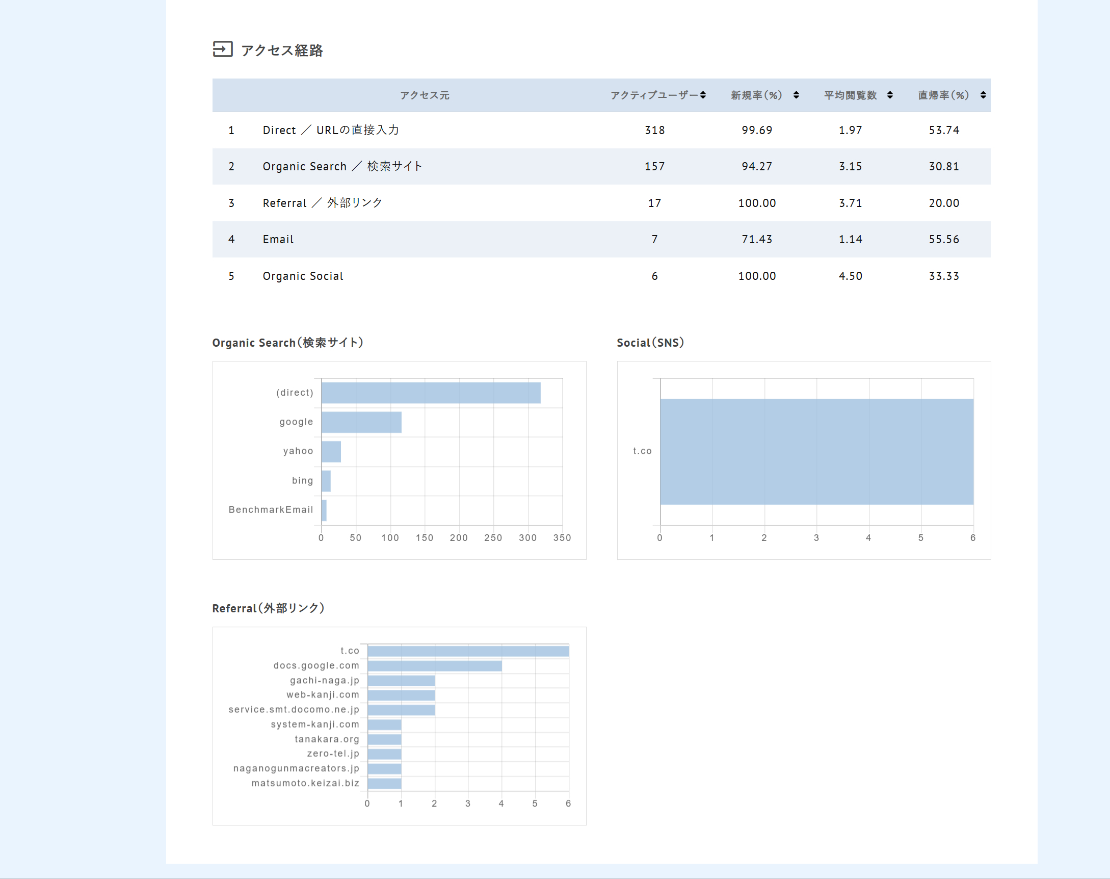 訪問者がどこから来ているのかを知ることで、どの集客経路が効果的なのかを把握できます。