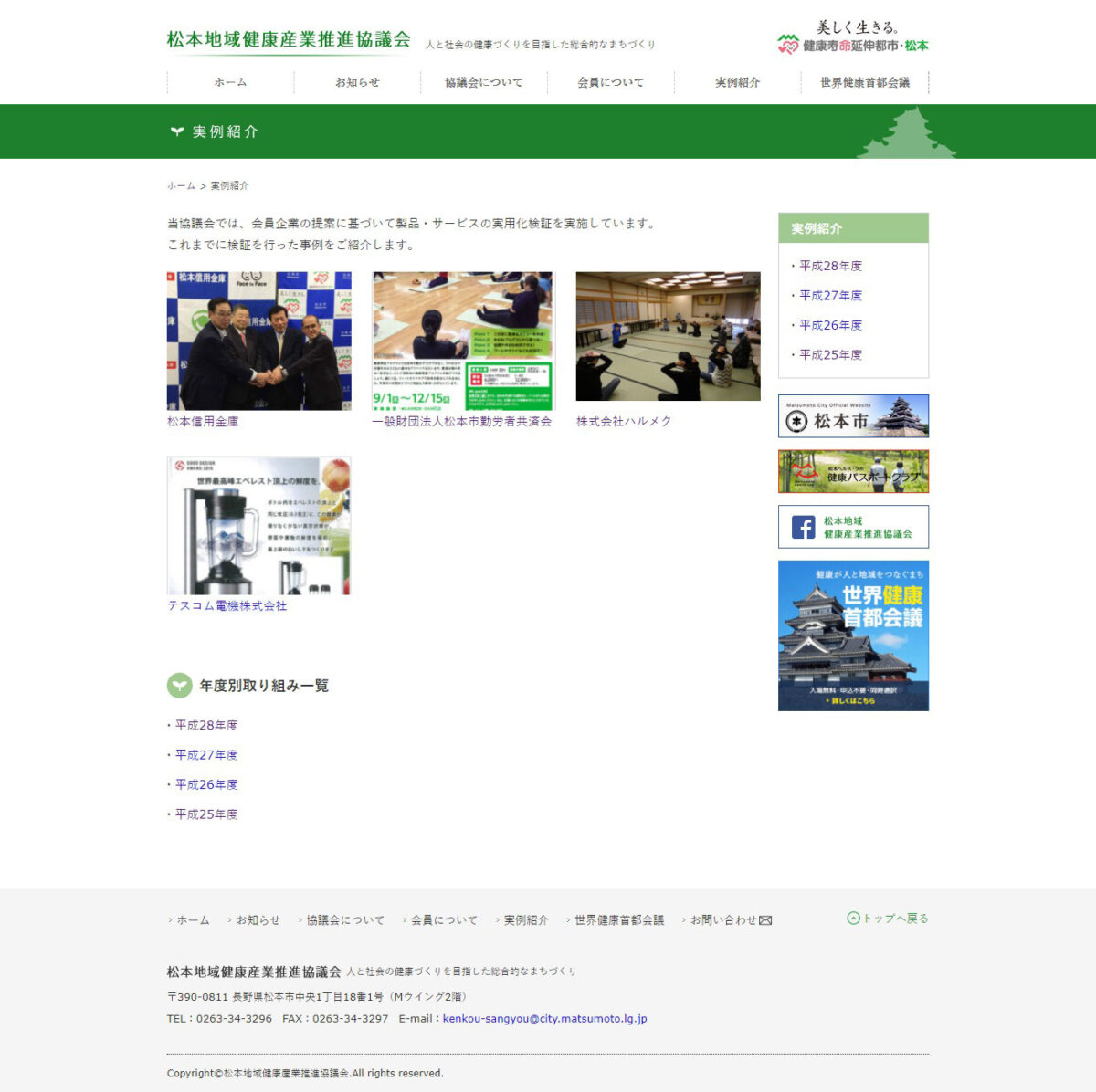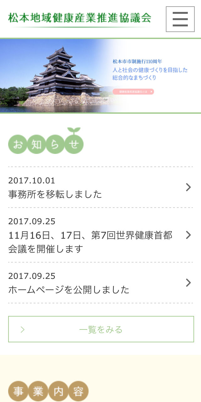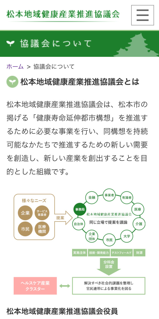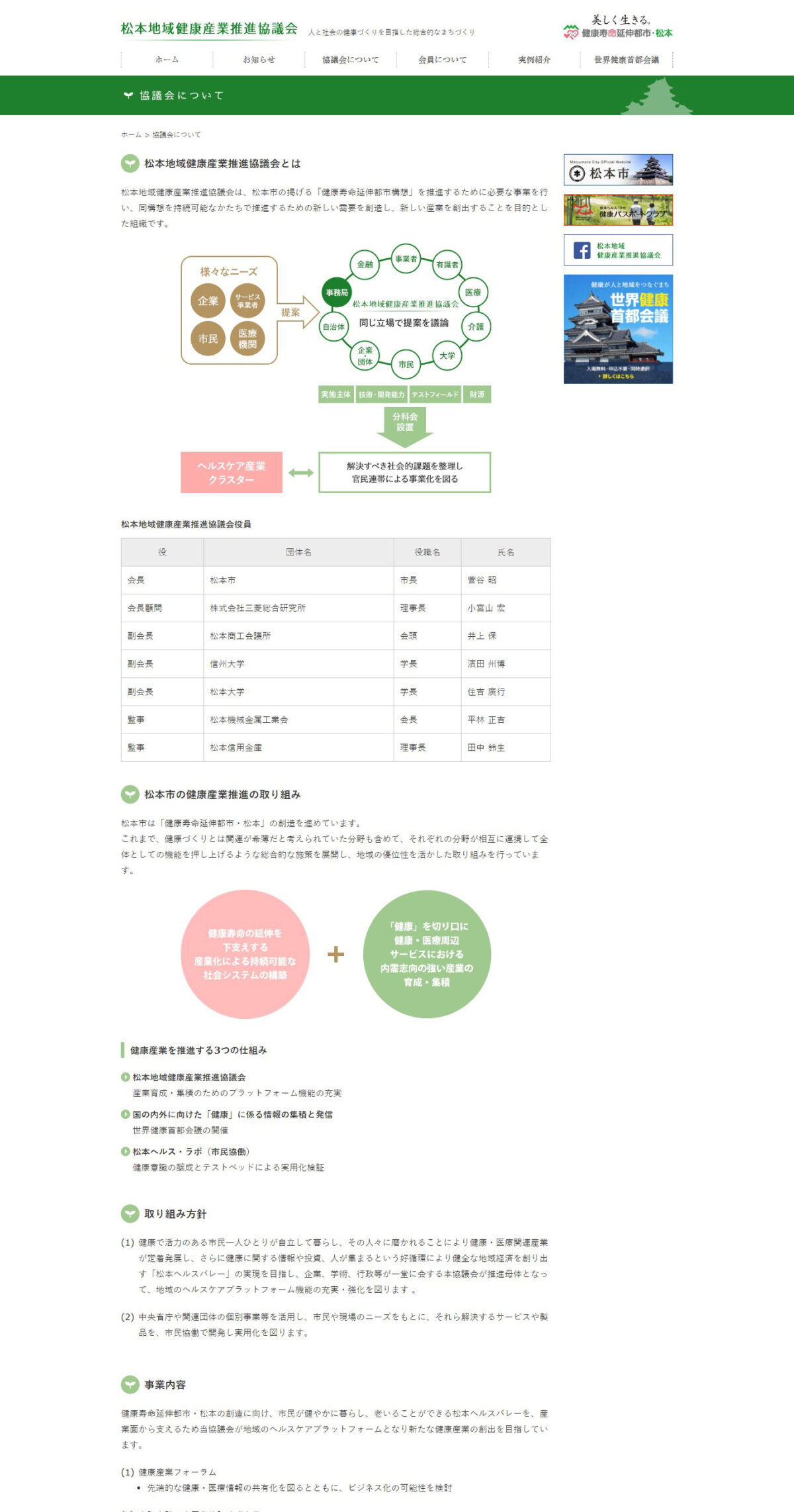 松本市の掲げる「健康寿命延伸都市構想」を推進するために必要な事業を行う松本地域健康産業推進協議会のサイト。