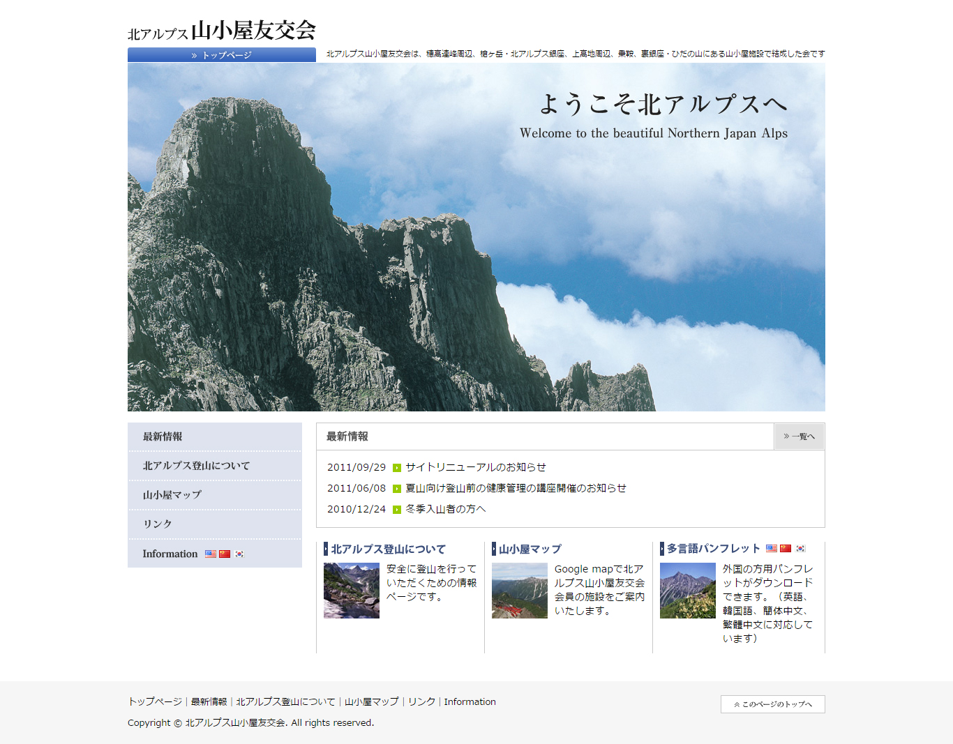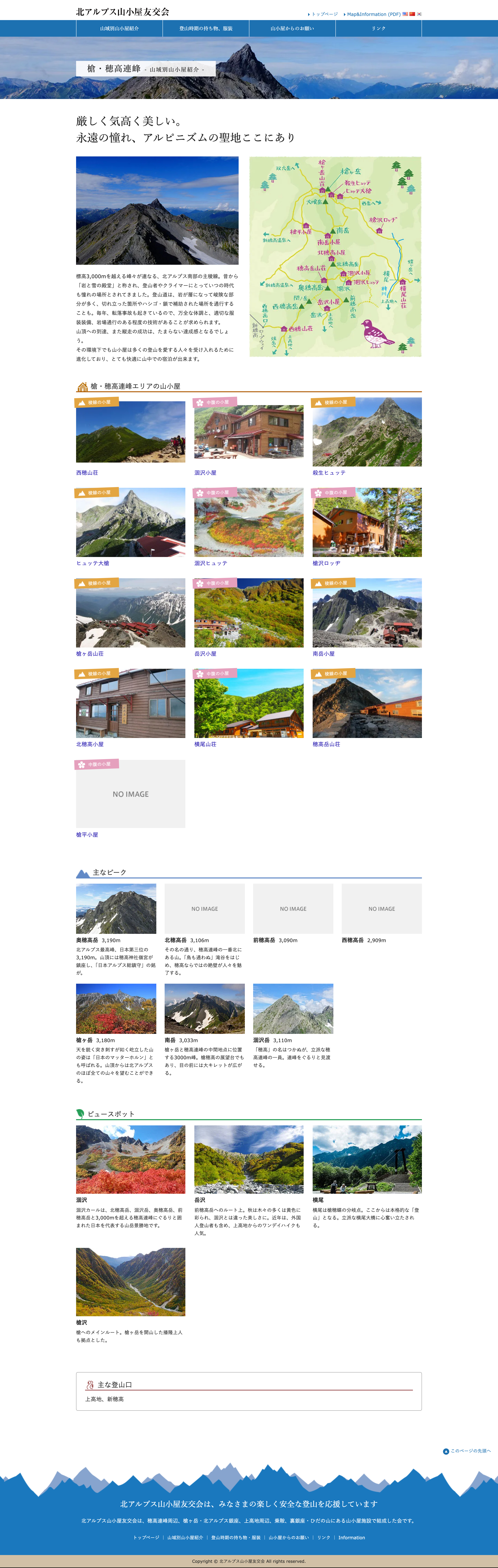 穂高連峰周辺、槍ヶ岳・北アルプス銀座、上高地周辺、乗鞍、裏銀座・ひだの山にある山小屋施設で結成された「北アルプス山小屋友交会」のウェブサイト。