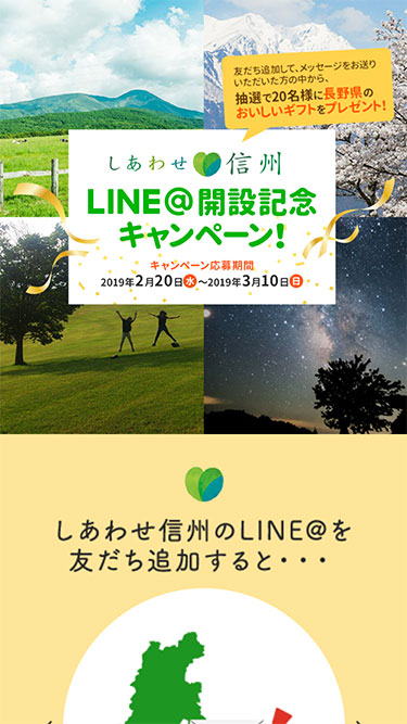 長野県観光部信州ブランド推進室が新たに開設した「LINE@」の周知と友だち追加を促すキャンペーンのLPです。