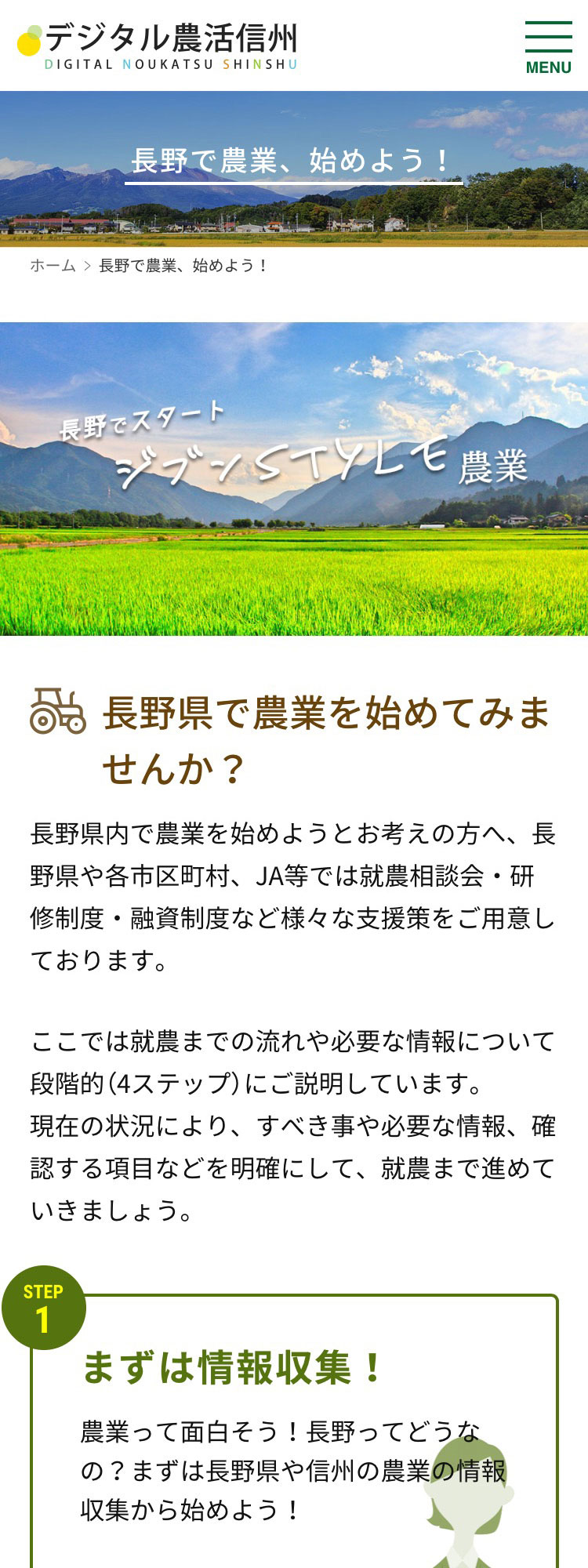 長野で農業を始めようと考えている新規就農者の状況に合わせて、4つのステップで適切な情報をお届けしています。