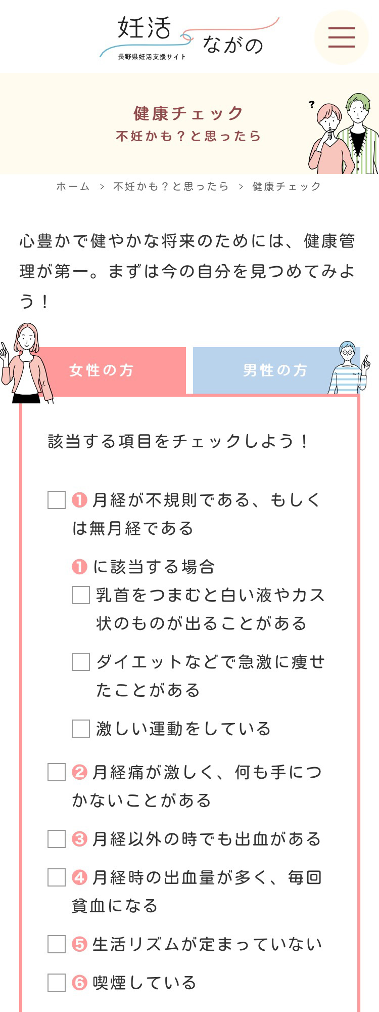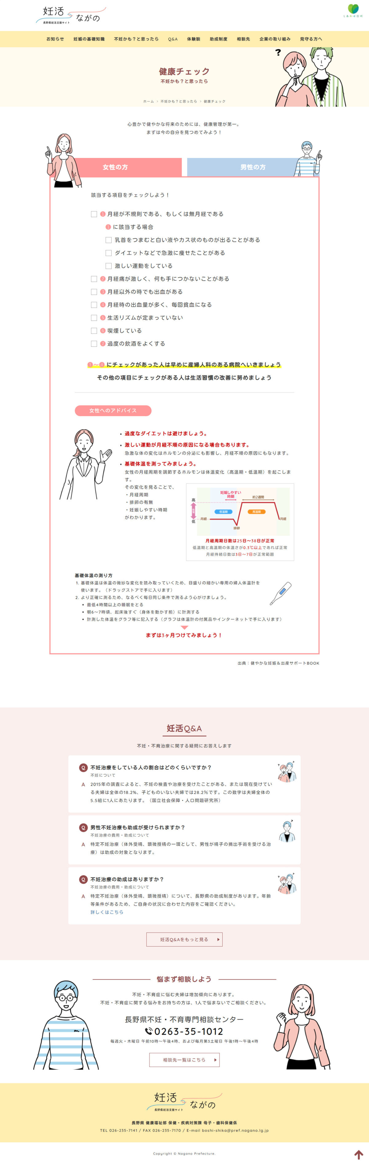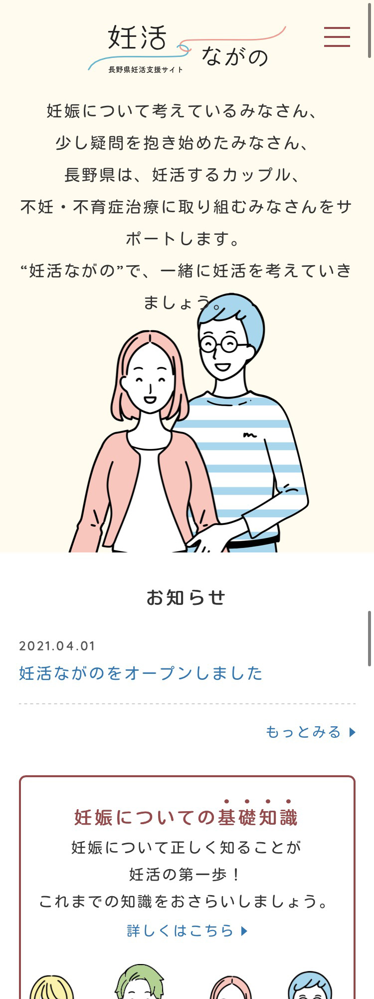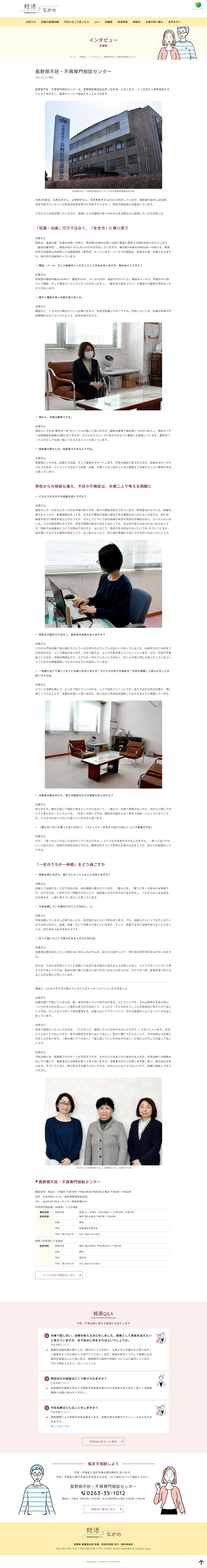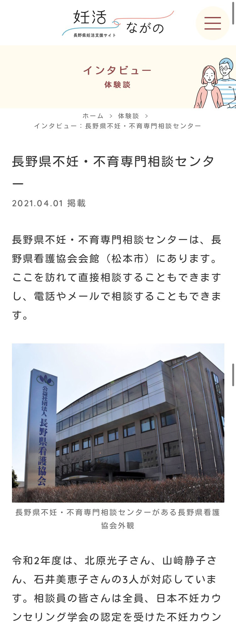 長野県が、不妊・不育症治療に取り組む方をサポートするために立ち上げた長野県妊活支援サイト。 不妊治療等の詳細や、経験者の体験談、治療と仕事の両立支援の紹介など、多角的なコンテンツを掲載しています。 長野県不妊・不育専門相談センターを取材したインタビューも制作しました。