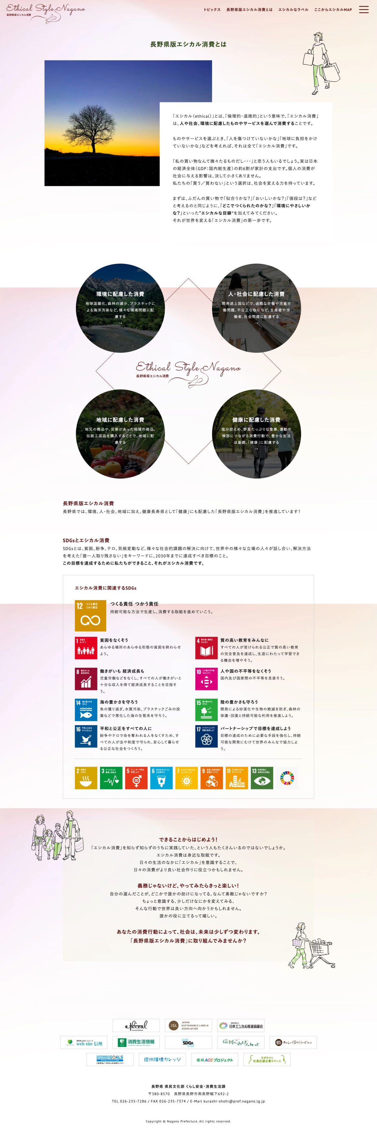 長野県版エシカル消費「Ethical Style Nagano」は、長野県が推進している、環境、人・社会、地域に加え、健康長寿県として「健康」にも配慮した「長野県版エシカル消費」を紹介するサイトです。