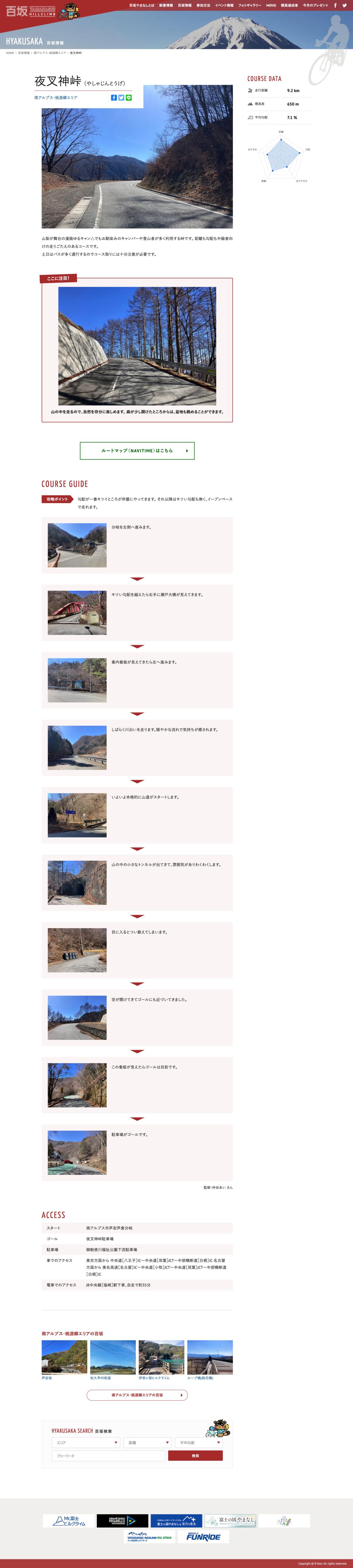 コースごとに走行距離や高低差などのデータを詳しく掲載するとともに、5項目のレーダーチャートで坂の特徴を視覚的にわかりやすく紹介。データやエリアからの検索機能も実装しています。