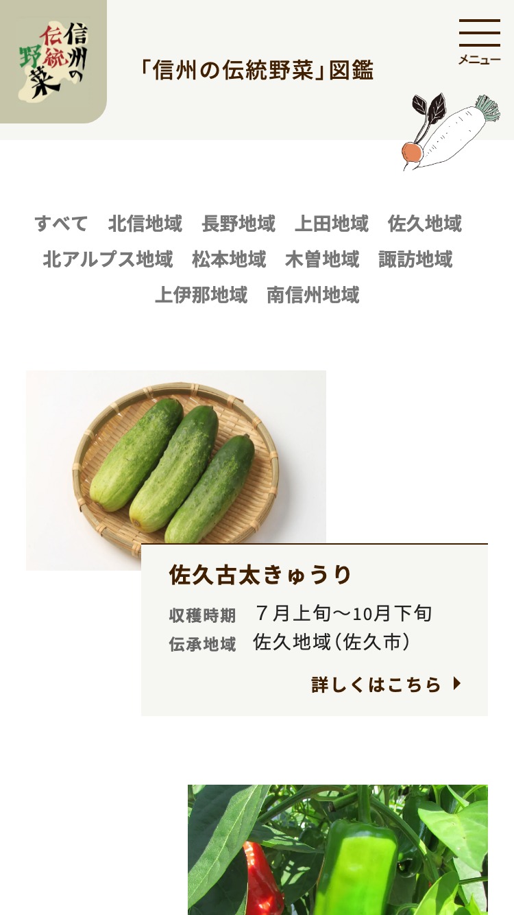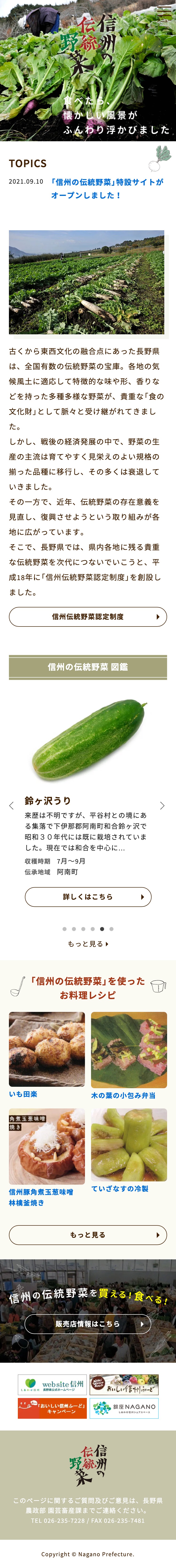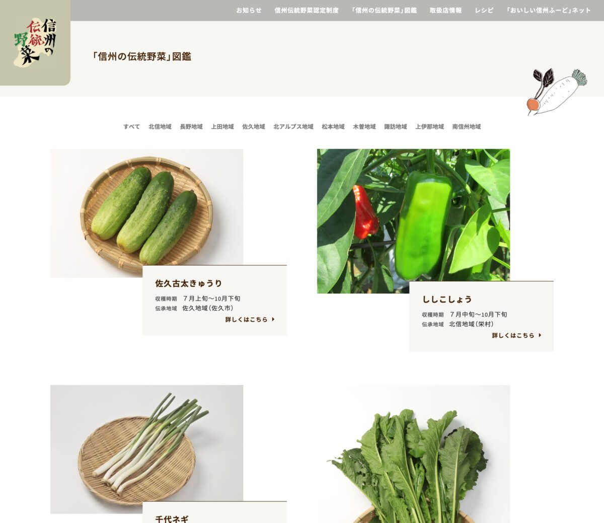 独自コンテンツに加えて、「信州の伝統野菜」の品目情報やレシピを「おいしい信州ふーど」ネットから抽出して掲載しています。