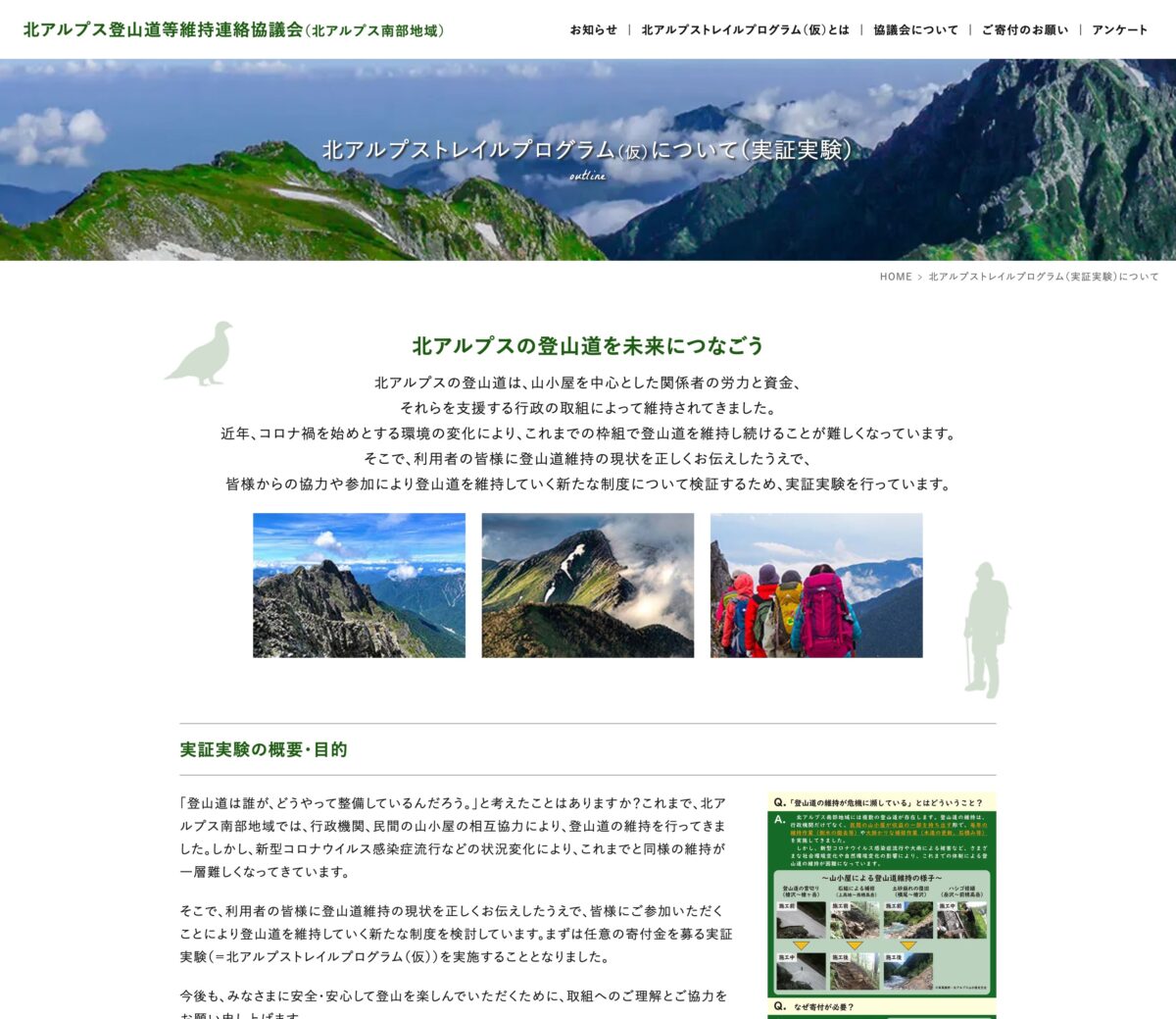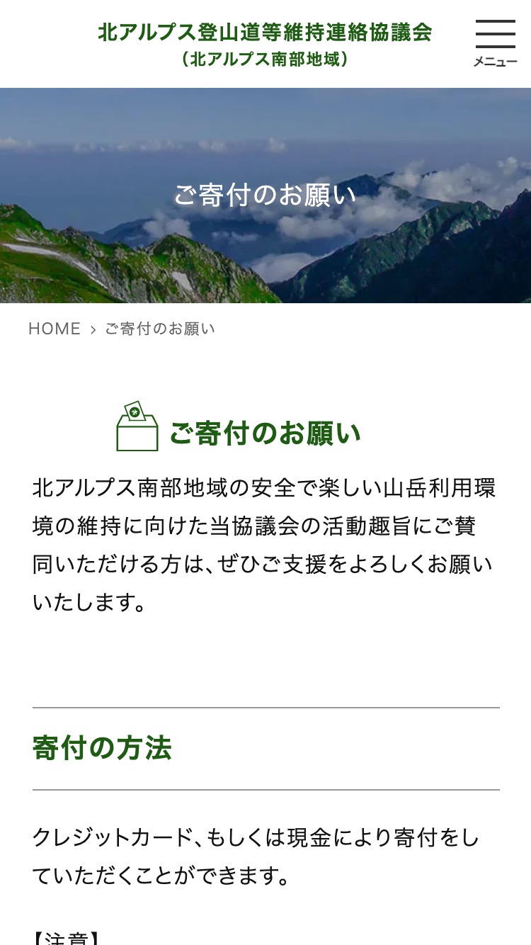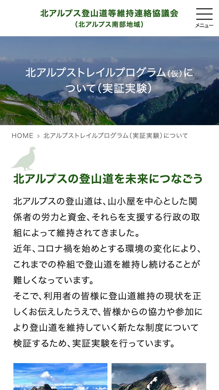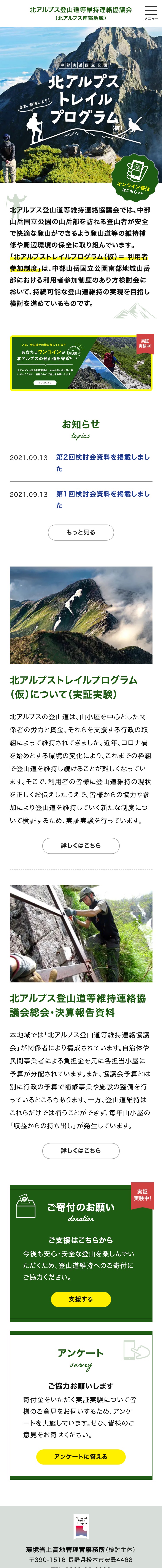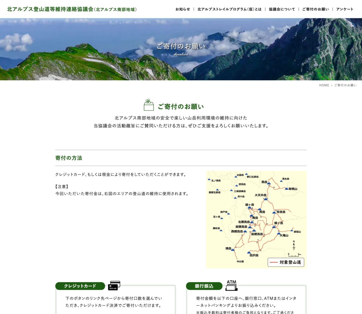 北アルプス南部地域の登山道の維持、周辺環境の保全を行なっている「北アルプス登山道等維持連絡協議会」のウェブサイト。