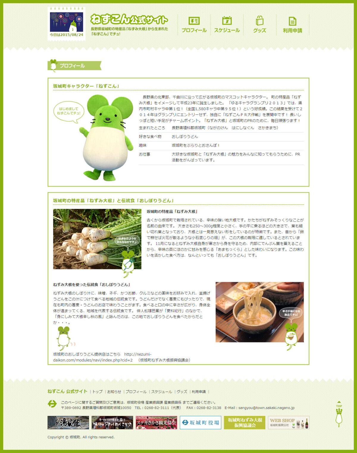 長野県坂城町の特産品「ねずみ大根」から生まれた町のマスコットキャラクター「ねずこん」の公式サイト。
